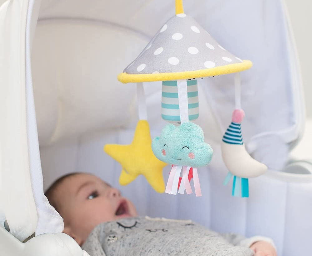 Un móvil llama la atención del bebé, y si está cansado, su movimiento y música (en caso de que la tenga), puede calmarle incluso hasta llevarle a concebir el sueño.