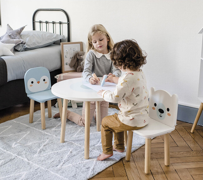 Janod - Mesa y 2 sillas de madera con forma de témpano - Mesa infantil redonda con portalápices extraíble - 1 silla con forma de oso polar y 1 silla con forma de pingüino - A Partir de 3 años, J09650
