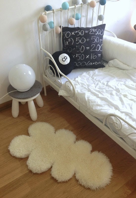 Pero no por eso tienen que ser todas iguales. La clave está en darles un toque personal, por eso os dejo una buena "hacker idea": convierte la alfombra de piel de oveja de Ikea en una alfombra nube para la habitación infantil. Ideal de cara al invierno, por el gusto de pisar una superficie suave y calentita al levantarse.
