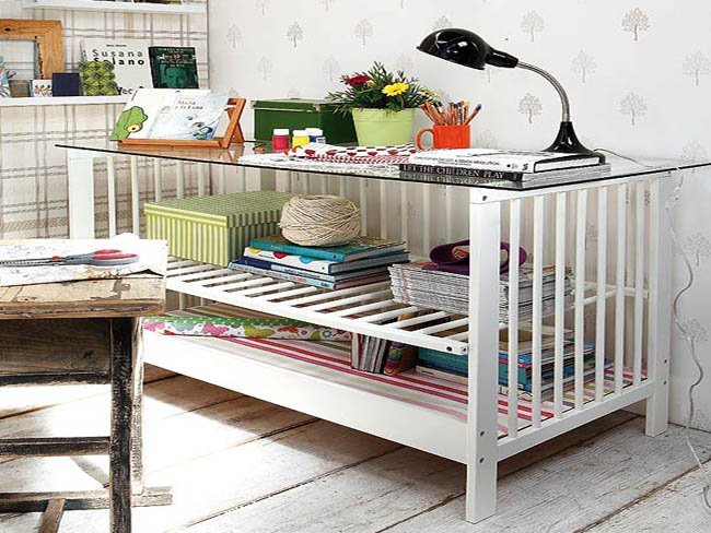 Una vez que el bebé está preparado para pasar a la cama, la cuna ya no es necesaria como tal, por tanto salvo que tengáis pensado agrandar la familia en un futuro, si quitáis uno de los laterales y le colocáis un cristal encima, puede convertirse en un nuevo mueble.