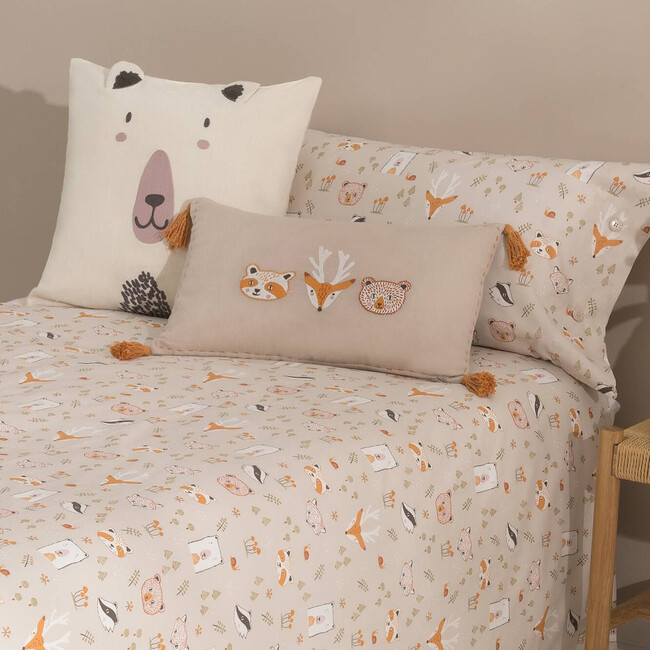 Set de sábana encimera y funda de almohada niños de algodón percal de 180 hilos con estampado de animales del bosque. La funda de almohada se cierra con botones. Este estampado también está disponible en el set de funda nórdica y almohada, y su precio es de 34,90 euros y 49,90 euros respectivamente.