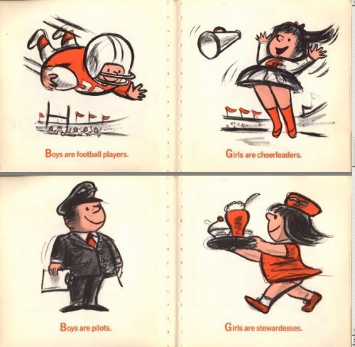 Al parecer, el libro fue publicado como sátira en 1970. Una tira cómica, que sin duda reproduce muchos tópicos, algunos no tan superados 40 años después. Porque, ¿qué me decís de eso de que los niños juegan con camiones y las niñas con muñecas? Anuncios publicitarios de este tipo inundan cada día nuestros televisores...