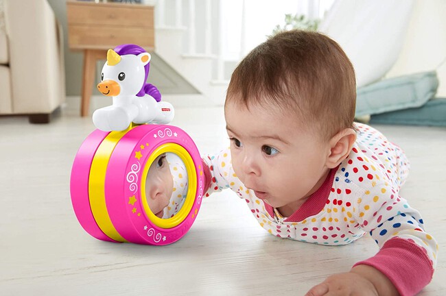 Este juguete anima al bebé a gatear gracias a su forma, ya que se balancea cuando se toca y además tiene música y sonidos divertidos. El espejo de unicornio y brillante son perfectos para cuando está boca abajo.