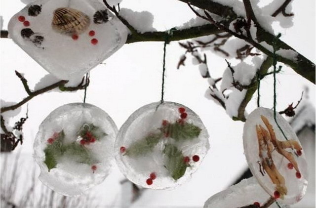 Inicialmente y como podéis ver en la imagen superior, son simples adornos metidos dentro de hielo que podemos colocar en el exterior de nuestras casas. Los que vivís en zonas donde al invierno haya que llamarle con mayúsculas podéis realizarlos con vuestros hijos las próximas Navidades.