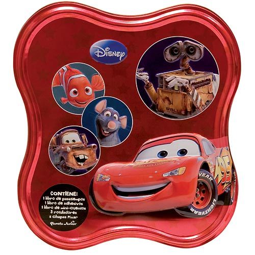 Pero si no queréis tanto tono pastel os propongo otra caja metálica más animada. Se trata de la "Caja metálica Disney Pixar", llena de sorpresas de los personajes de Disney Pixar: Cars, Nemo, Ratatuille, E-Wall... En esta caja metálica encontramos un libro de pasatiempos, un cuaderno de actividades para completar con adhesivos, un cuaderno con cinco mini-cuentos, un set de rotuladores y cinco chapas Pixar.