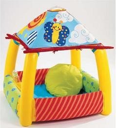 Está elaborada en vivos colores, lo que facilita la estimulación visual del bebé, además incorpora una práctica mosquitera transparente lo que permite que el niño esté resguardado de la picadura de los insectos en el caso de que saques la casita al jardín, y como la mosquitera es transparente, permite que siempre tengas contacto visual con el pequeño.
