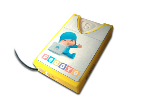 El ratón de Pocoyó consta de una parte inferior, con 4 gomas antideslizantes y un led rojo (el ratón es óptico y tiene una resolución de 1200 dpi) y de una parte superior decorada con el personaje en cuestión. En esta parte superior nos encontramos con tres botones. El derecho y el izquierdo los ofrece la plantilla. El botón central está en la misma caja de Smint, es de color blanco y lleva en el centro una gran "S", que quiere decir que es el ratón de "Super Pocoyó".