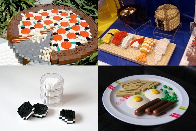 Hay que ver el juego que pueden dar estas piezas. Para variar un poco las formas, además de coches, naves y casas podéis crear sushi, galletas, pizzas, hamburguesas, salchicas, tartas, cupcakes. La pinta de los platos es muy real, si os fijáis bien la pizza tiene queso derretido y al sushi hasta dan ganas de incarle el diente.