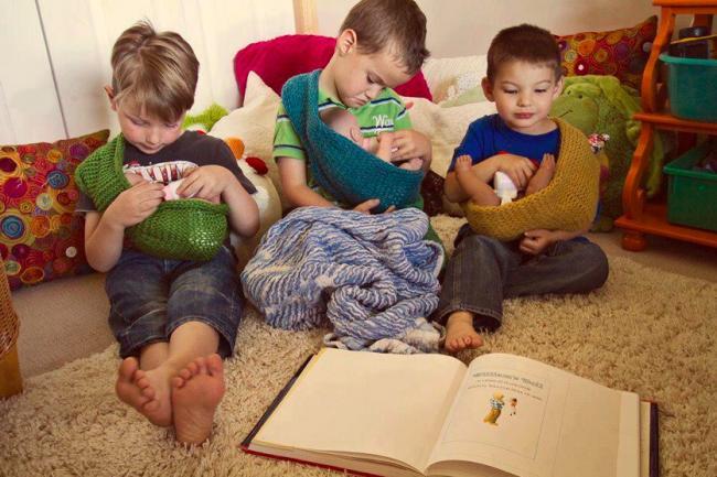 Los tres niños de la fotografía (que podrá estar más o menos preparada) están tan tranquilos con sus muñecos de bebés en un foulard mientras los miran y acarician, probablemente al tiempo que escuchan un cuento o ven un libro. Bonita imagen, que efectivamente nos parece extraña, extraordinaria.