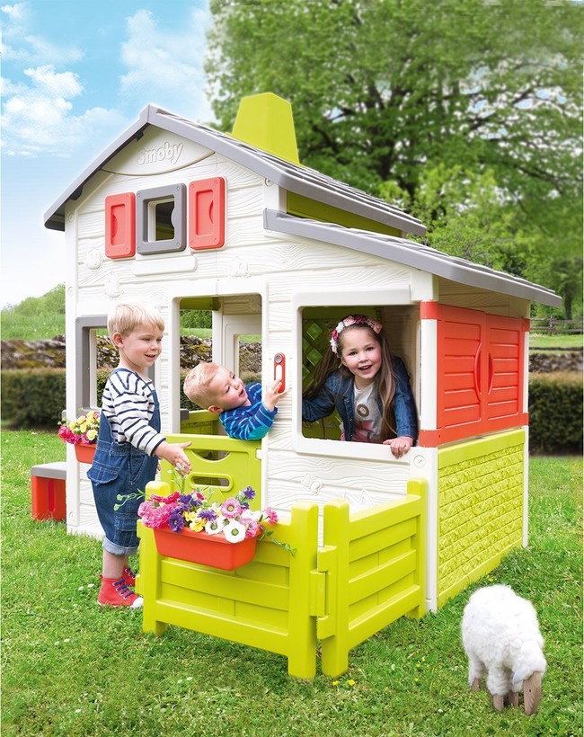 Casita de juegos para el jardín que incluye una mesa de doble posición (exterior e interior), zona de jardín con dos maceteros, dos ventanas con orientación de 360º, una puerta doble y timbre electrónico. Además, toda la casa ha sido tratado con un sistema anti-uv que evita la pérdida de color y resistencia a los rayos solares.