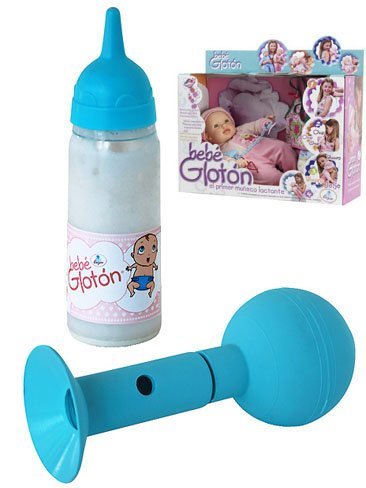 El Bebé Glotón se vende con un top con dos flores que las niñas se ponen en el pecho, y al acercar el bebé a las flores hace un ruido como si estuviera siendo amamantado. El sacaleches también se acerca al top y se conecta por un agujerito a un biberón mágico, de esos en los que aparece y desaparece la leche. Al presionar la pereta el biberón se llena y está listo para darselo al bebé.
