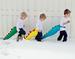 Coge los cuatro trozos y cóselos de dos en dos, una vez terminado te quedan dos piezas, cose los velcros en estas piezas, cada uno en un extremo a la misma altura para que puedan pegarse correctamente. Cose cada una de estas tiras en las piezas principales, en los triángulos amarillos, cada una justo en medio de la parte que mide 28 cm.