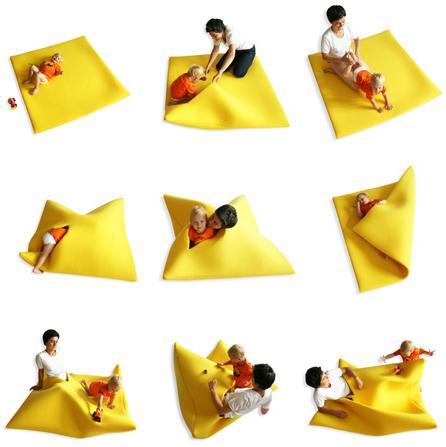 Paseando por la red hemos encontrado una alfombra de juegos que seguramente dará mucho de sí, es aparentemente muy simple, un cuadrado con doble capa y con una obertura que permite meterse dentro, lo que se podría decir que hace de saco (de ahí que nos provoque desconfianza para que sea un área de juego para el bebé, pues muchos padres ya sabemos que dejan a los peques solos y esto podría ser un peligro).
