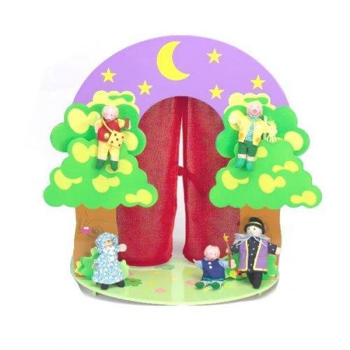 Este teatrillo es de Eureka Kids y cuesta 26 euros. Nos lo envian a casa y está pensado para muñecos de aproximadamente 14 centímetros. Las marionetas no están incluídas en el lote.