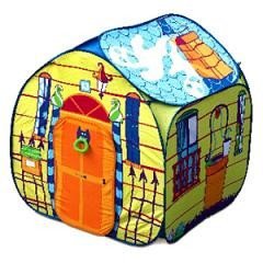 Se trata de una casita plegable fabricada en nylon y con motivos decorativos muy divertidos, como una chimenea, un buzón, ventanas, suelo imitando baldosas, etc., incluso dispone de una aldaba en la puerta.