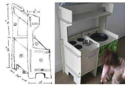 Mi último hallazgo en este sentido, ha sido la maravillosa cocinita para jugar que ven en la foto, que está hecha con cartón y me parece que tiene una pinta genial, si yo fuera una niña me encantaría tener una. Es obra de la autora del blog forty-two roads y para aquellos que se animen a hacer la suya, en su tienda en Etsy, se puede adquirir un patrón con los planos para hacer la cocina por 7 dólares americanos.