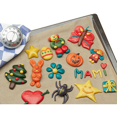 Se trata de una mezcla para hornear hecha con colorantes vegetales y que tiene todo el aspecto de la plastilina. Se presenta en forma de polvo al que si le agregamos agua se convierte en una masa suave que podemos modelar fácilmente para después hornearla.