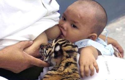 Y no es sólo propia de madres humanas, en la web hay muchas fotos de animales amamantando a crías de otra especie. Abajo podéis ver a otra mujer con un monito y a una perra amamantando a tigres pero también hay gatas con perritos, tigresa con cerditos, etc.