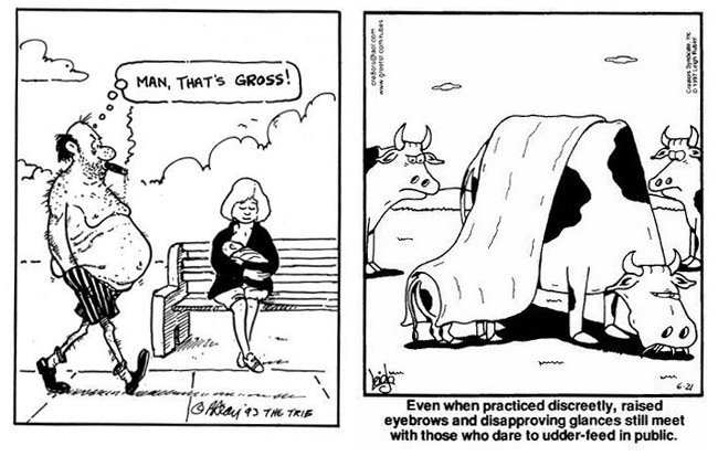 Como muestra para caricaturizar un poco lo que comento os traigo estas dos viñetas en las que podemos ver a un caballero descamisado, fumando un puro y mostrando su cuerpo semidesnudo criticando mentalmente a una mujer que da el pecho a su bebé en un banco y a una vaca amamantando a su cría tapada, para que nadie se moleste, que dice algo así como: “incluso cuando amamantas discretamente, hay quien levanta las cejas y mira con desaprobación a quien se atreve a alimentar en público“.