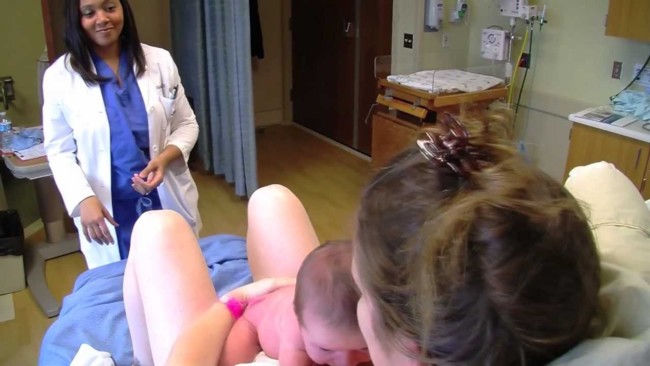 En el primer caso, presentado como la forma en la que el bebé quiere nacer, el nacimiento se produce en una habitación normal, con la asistencia de una matrona y la presencia del papá, que apoya a su pareja y le da masajes en la espalda.