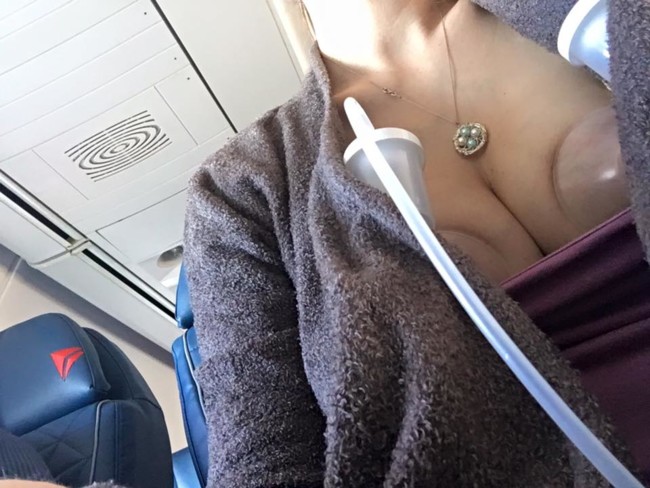 Con todo el cuidado que pudo, y tratando de ser discreta, se puso la bomba extractora en sus pechos y empezó a sacarse leche. Cuando las azafatas se dieron cuenta de lo que estaba haciendo decidieron ayudarle.