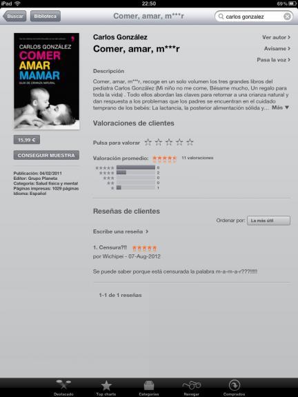 Últimamente trasteo mucho iTunes, lo cual me ha descubierto alguna sorpresa como la que comparto con vosotros. Una obra tan conocida en el mundo de la maternidad como “Comer, amar, mamar” de Carlos González aparece en el popular canal de venta censurado en el título.