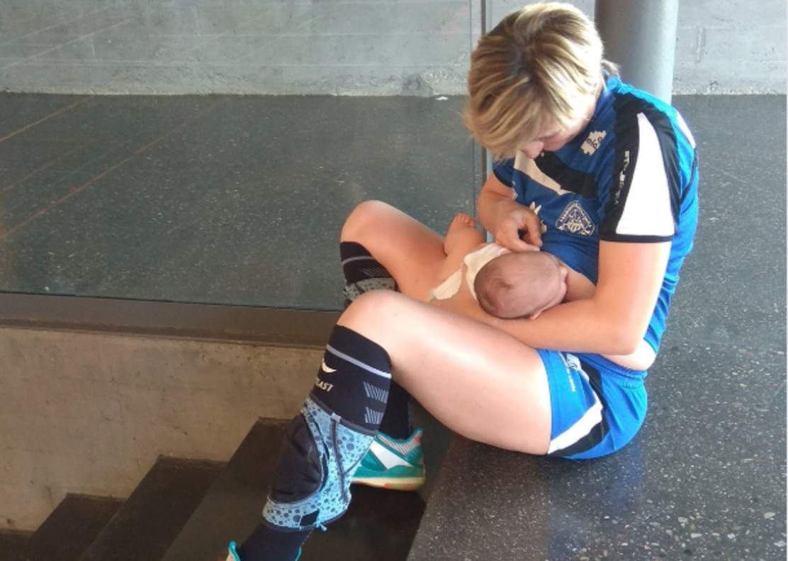 Esta mamá reciente de 29 años, jugadora en la Segunda División de Balonmano, durante el partido del pasado domingo, fue sorprendida dando el pecho a su bebé de apenas dos meses y medio, en el descanso.