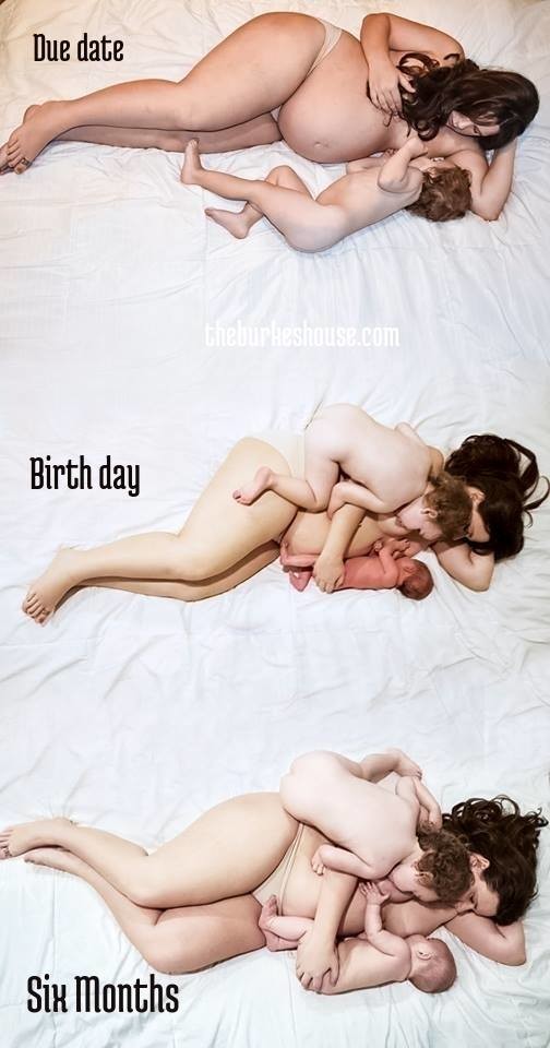 No es "la foto" en realidad, sino las fotos, pues son tres imágenes en una. En la primera vemos a Ashley amamantando a su hijo el día en que sale de cuentas del que será su segundo bebé. En la siguiente, la vemos dando el pecho a la bebé recién nacida, en la misma posición, con el mayor buscándose la vida para encontrar el alimento en el otro pecho, llegando casi desde detrás, y la tercera es la misma imagen, en la misma posición, seis meses después.
