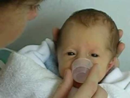 De esta manera se evita la "confusión de succión", pues la manera en que se bebe del vaso es totalmente diferente a como se succiona de una tetina o del pecho. En las imágenes vemos a unos bebés prematuros (35 semanas) que fueron alimentados de ese modo hasta el mes de vida, cuando comenzaron a mamar eficazmente.