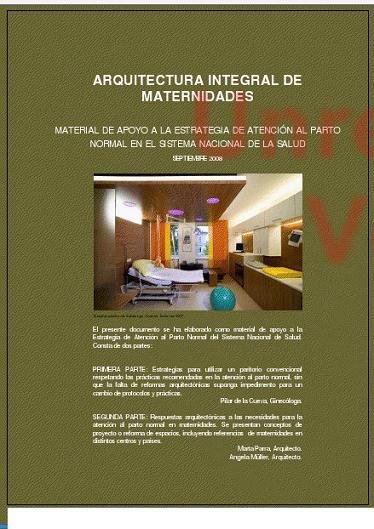 “Arquitectura integral para maternidades” es un documento de excepcional interés, realizado a petición del Ministerio de Sanidad por la ginecóloga Pilar de la Cueva y las arquitectas Marta Parra y Ángela Müller, integradas en el grupo de trabajo que dio nacimiento a la Estrategia de Atención al Parto Normal y miembros de la Asociación El Parto es Nuestro.