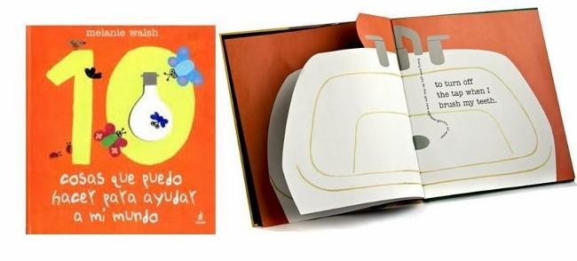 Es un libro muy bonito, con algunas páginas a modo de solapa y troqueladas con las que los niños se entretienen explorando, un libro que combina texto con bonitas ilustraciones de manera creativa y que les enseña a gestos sencillos pero muy importantes para ayudar a conservar nuestro entorno natural. Reciclar, ahorrar energía, cerrar el grifo, reutilizar, ir andando al cole...