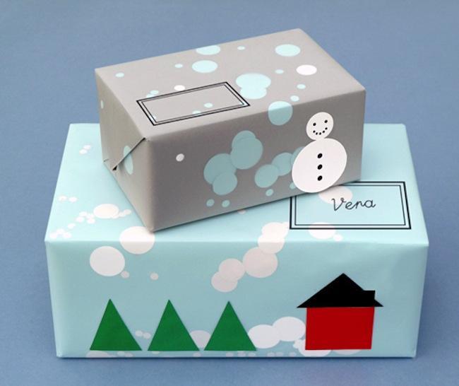 En la web de diseño Design Sponge nos enseñan con un tutorial paso a paso a hacer este simpático papel de envolver. Con recortes circulares enganchados con pegamento hacemos las nubes y la nieve, con triángulos verdes, los árboles de navidad y con un cuadrado rojo y un triángulo negro, una casita navideña.