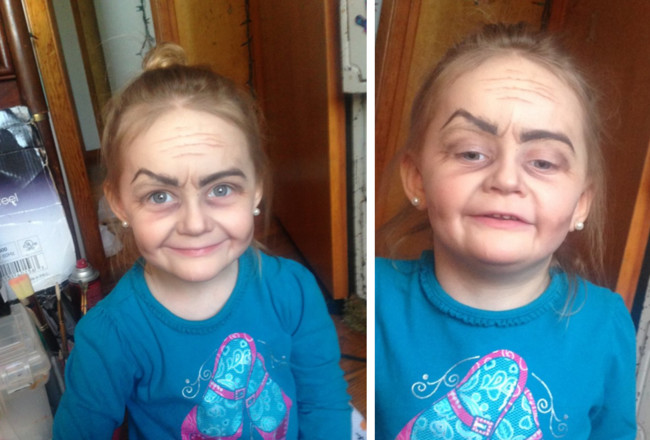 La niña la vio maquillándose y le pidió que le hiciera algo también, y la tía, en vez de maquillarla según pudiera esperarse (a lo princesita) pensó que sería mucho más divertido convertirla en una simpática abuelita.