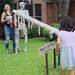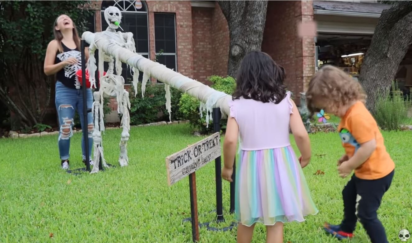 La decoración del 'tobogán lanza caramelos' es la parte más divertida y creativa, en la que seguro que vuestros peques querrán colaborar. Los youtubers han decidido pintar de negro los soportes de apoyo y forrar el tobogán con vendas. Para darle un aspecto más siniestro, han utilizado un esqueleto tamaño real que simula estar cargando sobre su hombro el lanzador.