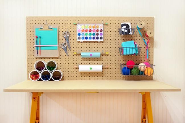 Todo lo que necesitáis son dos tableros de madera o aglomerado y unos caballetes que sirvan como patas. Pero lo más interesante es lo que va colocado en el tablero que va amurado a la pared, en el cual se colocarán cestos, colgadores y todo tipo de accesorios que servirán para guardar ceras, pinturas, pinceles y demás.