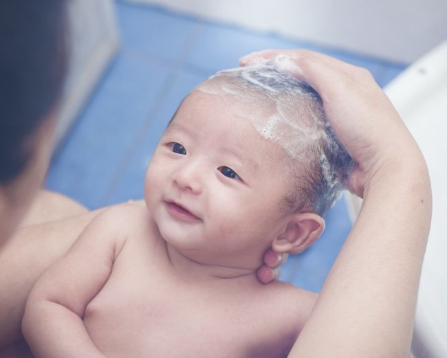 Al principio lávale la cabeza con el mismo jabón que el resto del cuerpo, teniendo cuidado de que no le entre en los ojos. Pasadas unos quince días puedes lavársela una vez por semana con un champú especial, suave y de pH neutro, que no provoque irritación si accidentalmente entra en los ojos.
