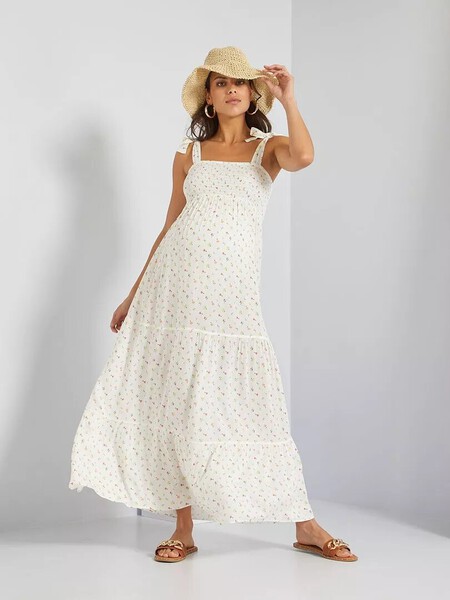 Igualmente ligeros y frescos son los vestidos largos premamá del catálogo de Kiabi. Entre ellos encontrarás diseños estampados con un patrón muy favorecedor a base de falda vaporosa, escote cuadrado y tirantes anudables. Son perfectos tanto para los looks del día a día como para alguna ocasión especial.