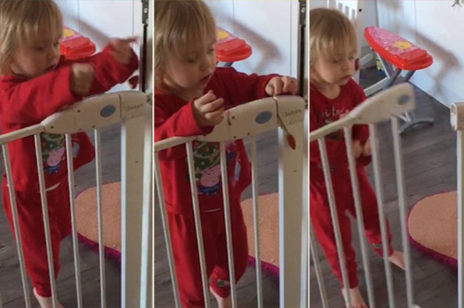 Un sábado, mientras la madre estaba fregando los suelos dejó a la niña encerrada para evitar resbalones, pero consiguió salir. Quiso averiguar cómo la niña lo había logrado, así que volvió a encerrarla y se escondió para grabarlo con el móvil. Fue así que descubrió su novedosa técnica.