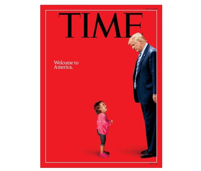 A pesar de que Trump ha dado marcha atrás y firmó ayer un decreto para evitar la separación de las familias migrantes, un reflejo de la falta de humanidad de su política es la portada de julio de la revista Time, de las más críticas y duras que ha publicado en los últimos años. En ella vemos a una niña migrante que llora frente a un Trump que la mira desde arriba, impidiéndole el paso y sin conmoverse en absoluto ante su sufrimiento. Junto a la imagen, el irónico titular "Bienvenida a América".