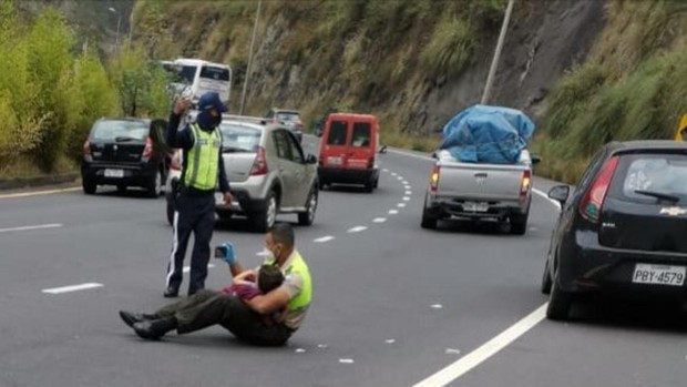 Así que decidió compartir en su cuenta de Twitter la imagen del agente sentado en uno de los tres carriles de la carretera, cerca de Quito. A su izquierda pueden apreciarse los vehículos siniestrados y, a su derecha, todos aquellos que circulan gracias a que uno de sus compañeros se coloca delante de ellos y dirige el tráfico.