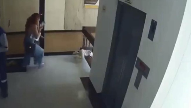 Una cámara de seguridad grabó lo sucedido en un edificio de oficinas de Medellín (Colombia), cuando una madre sale del ascensor con su pequeña de poco más de un año grabando notas de voz en su teléfono móvil.