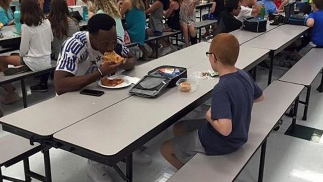 El martes pasado, dentro de un programa promovido por la FSU en el que miembros del equipo de fútbol visitan escuelas de la zona, Travis acudió al colegio de Bo, y al verlo sentado solo en la cafetería a la hora de comer decidió sentarse con él.