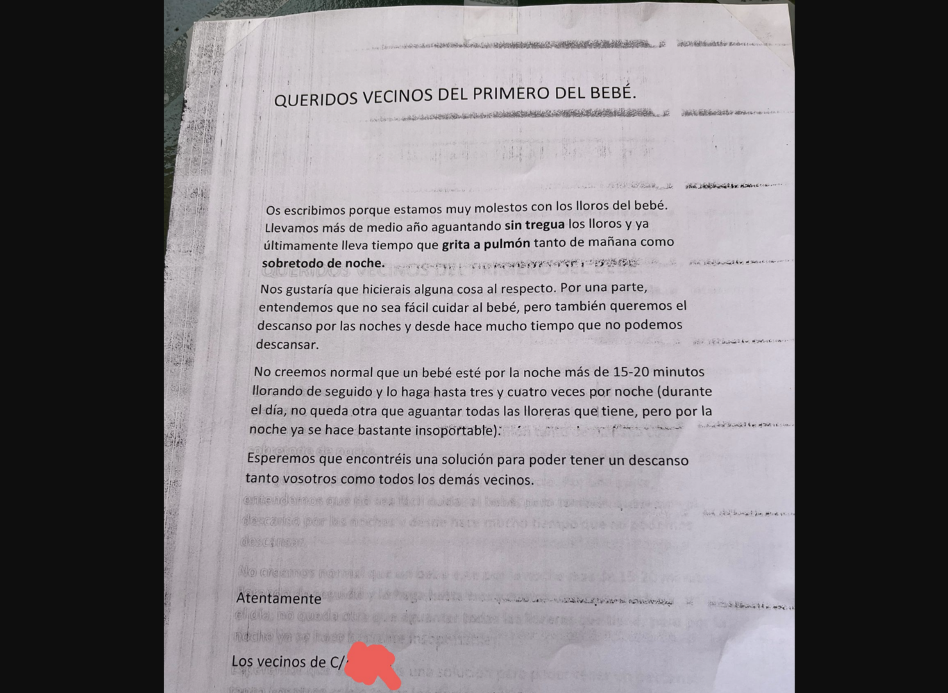 "Nos gustaría que hicierais alguna cosa al respecto. [...] No creemos normal que un bebé esté por la noche más de 15-20 minutos llorando de seguido y lo haga hasta tres y cuatro veces por noche. [...] Esperemos que encontréis una solución para poder tener un descanso tanto vosotros como todos los demás vecinos".