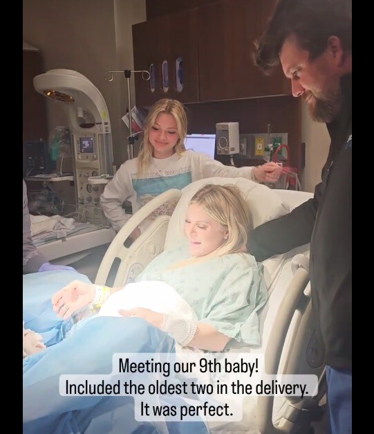 "Aquí conocimos a nuestro noveno bebé. ¡Incluimos a los dos mayores y fue un recuerdo que atesoraremos para siempre! Jenna cortó el cordón, Sam lo abrazó primero (después de mamá), ¡y ellos decidieron su nombre!