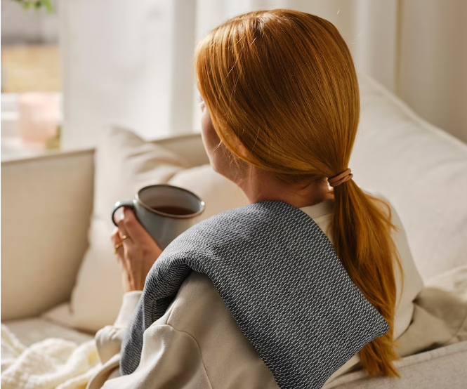 No necesita enchufes, ni baterías, ni nada. Es la almohadilla térmica ÄNGSSMYGARE, una almohadilla con un relleno natural de huesos de cereza que se calienta en el microondas y que puedes colocártela en el cuello y en los hombros para aliviar contracturas y dolores musculares. Yo también la uso en la barriga para aliviar tensiones o dolores menstruales.