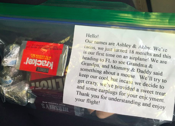 "Hola, Nuestros nombres son Ashley y Abby. Somos gemelas, recién cumplimos 18 meses y este es nuestro primer viaje en avión. Viajamos a Florida a ver a la abuela, al abuelo, y mamá y papá mencionaron algo sobre un ratón. Vamos a intentar mantener la calma, pero en el caso de que decidamos volvernos locas, os dejamos un dulce regalo y unos tapones de oído para su uso. Gracias por entenderlo y disfrutad del viaje".
