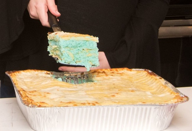 Es una lasaña con queso teñido de rosa o azul, según sea el caso, y que por fuera se ve como una lasaña normal, pero que al cortarla se descubre el color correspondiente al sexo del bebé.
