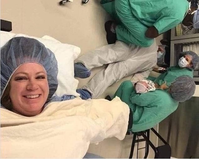 Según podemos leer en el diario Daily Mail, es probable que la mujer fuera sometida a una cesárea, pues aparte de llevar la cabeza cubierta por un gorro de quirófano, en la fotografía también puede verse una sábana o tela blanca protectora colocada delante de su cara, una práctica común en los partos por cesárea.