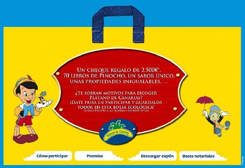Se puede participar hasta el 15 de mayo, si compramos un kilo de plátanos de canarias, rellenando y enviando el ticket de compra junto a un cupón que encontraremos en la frutería o desde la web de la promoción. Los primeros 3000 participantes obtienen una bolsa ecológica de regalo, y todos entran en un sorteo de 2500 euros y de 70 libros de Pinocho.