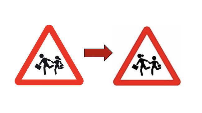 Tal es el caso de la señal P‐21a; una señal de advertencia de peligro por la proximidad de un lugar frecuentado por niños, como una escuela o una zona de juegos. En la actualidad, esta señal está representada por un niño que lleva de la mano a una niña, pero cuando el borrador entre en vigor los roles se invertirán, y será la chica quien agarre la mano del niño.